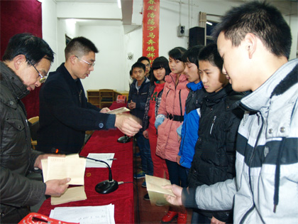 2014年2月27日晚7点,阳新一中2013-2014年度中奖彩票公益金在一中综合楼阶梯教室举行发放仪式。学校领导肖绪曙,学生资助管理办公司周老师,行政办公室程老师,王老师及受助的140名学生参加了发放仪式。