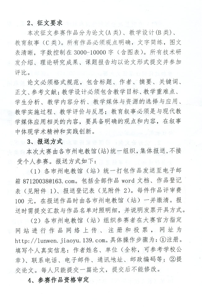 1、报送要求:本次活动由各地教研员统一组织报送,参赛作品须为电子稿,不接受传统纸质文稿。个人也可将作品存入U盘来县电教馆报名。