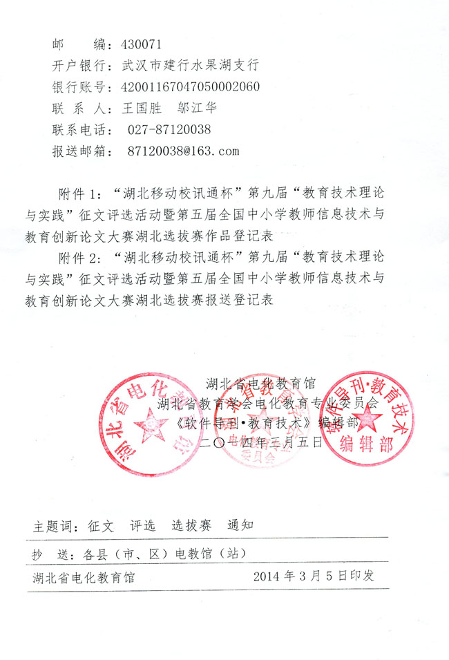 关于“湖北移动校讯通杯”第九届“教育技术理论与实践”征文评选活动暨第五届全国中小学教师信息技术与教育创新论文大赛湖北选拔赛的通知