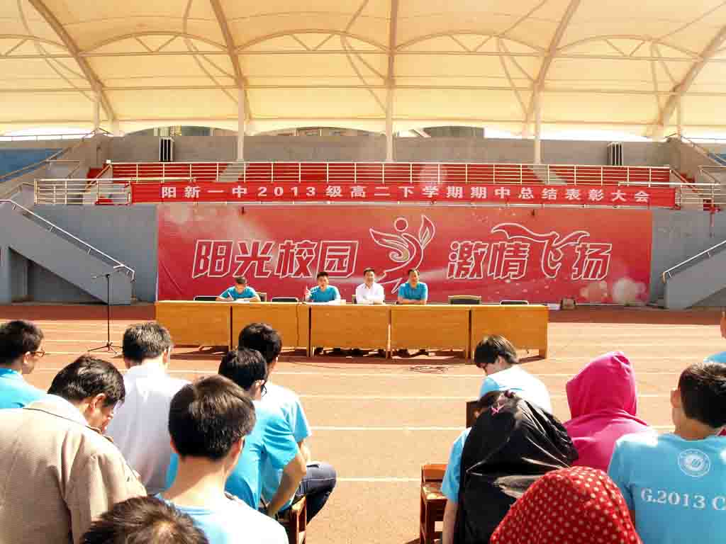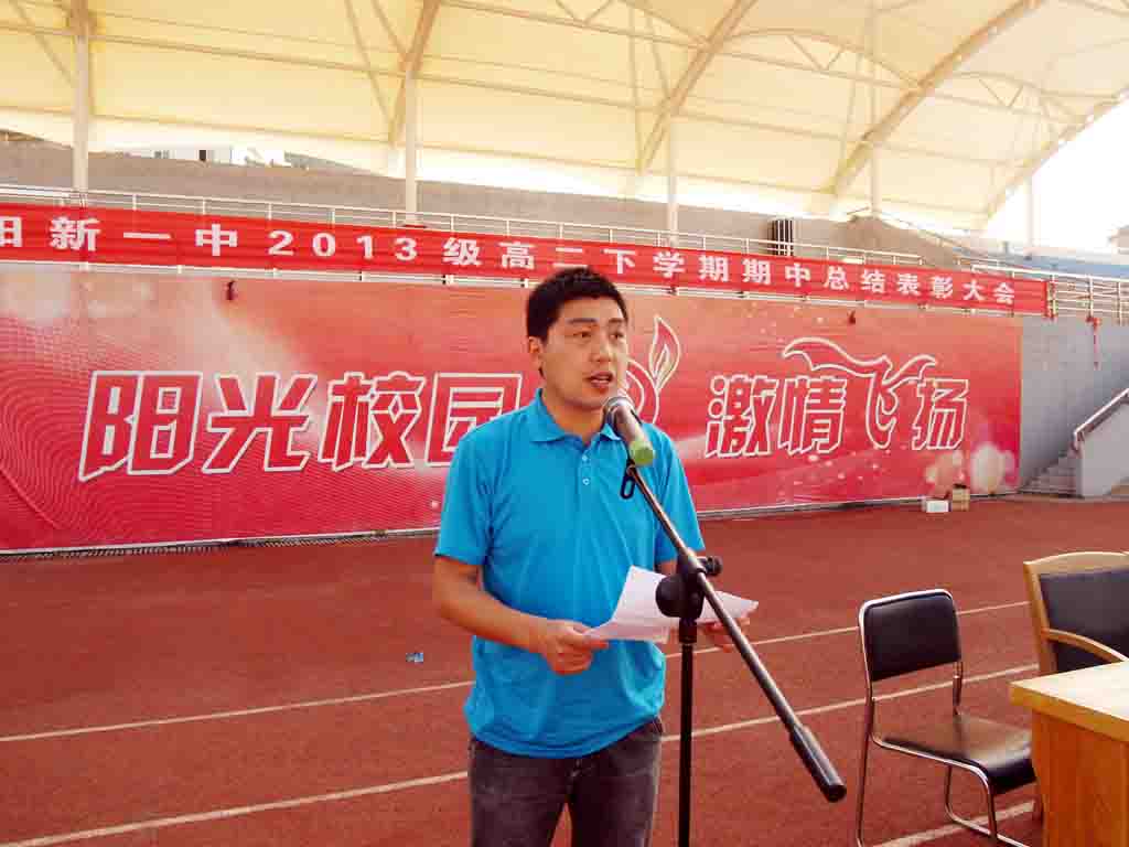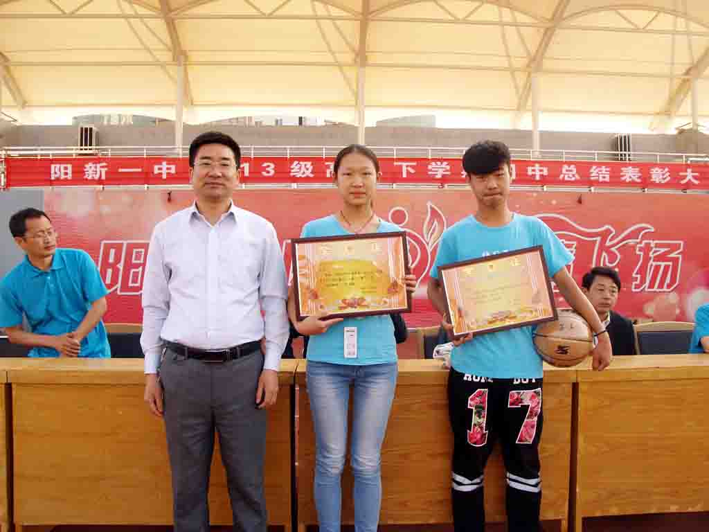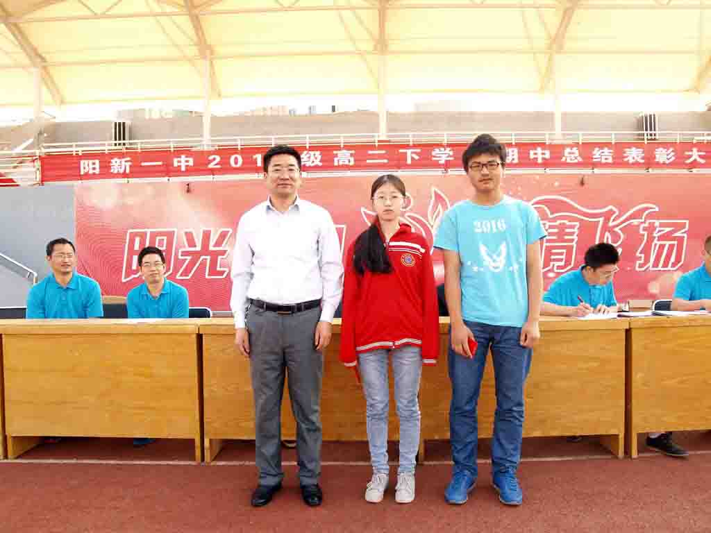 大会在雄壮的国歌声中拉开序幕,年级主任来胜强宣读了高二年级此次期中考试成绩突出或进步较大的优秀学生表彰名单,学校政教室主任石章权宣读了之前高二年级举办的“庆五四、展风采”球类运动会优秀班级和个人的表彰名单。获奖班级和学生代表兴高采烈依次上台领奖,并和台上的领导、老师合影留念,学校校长明道树亲自给此次期中考试文科第一名张晓曦同学、理科第一名陈圣涛同学颁发了奖品和荣誉证书。