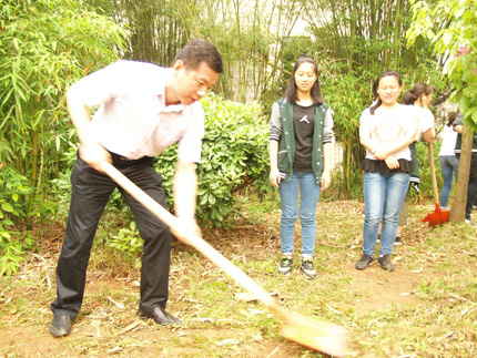 阳新一中副校长、高一年级负责人李永红(中间)亲临指挥劳动现场 |
