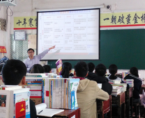 11月4日上午,金太阳教育研究院一行30多人来我校开展教学调研活动。其中,政治专家张伟平老师在高三(1)班教室为我校全体高三政治教师及高一、高二组长讲了一堂专业、精彩的高三一轮复习策略讲座。张老师以“彰显学科特色 引领教学改革”为主题,就2015年高考政治全国Ⅰ卷命题特点进行了仔细分析,并就2016年高三备考提出了一系列行之有效的建议,同时对2015版《政治生活》教材修订进行了说明,让我们受益匪浅。