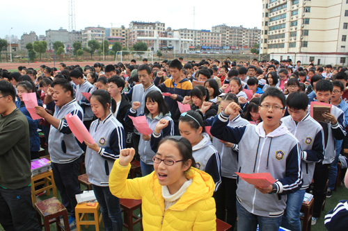 肖主席详细汇报了高三年级在高考目标、年级管理、班主任管理、教师管理、学生管理等几个方面的工作。从高三年级高考“468”目标到廊道文化、柱子文化、班级文化,从班主任每日常规“五到位”到教师每天听评课、每周两次集备,再到学生作业检查、限时检查、目标跟踪等,为全体到会人员呈现了一场高三紧张复习的激情大宴,并对全体师生提出了殷切的希望,更为良苦用心的是,肖主席将高三21个班各班的先进典型学生逐个表彰,反响巨大。最后,当肖主席用他激动而略带沙哑的嗓音高声呐喊 “2016届,必胜!”时,整个会场掌声雷动,经久不息。