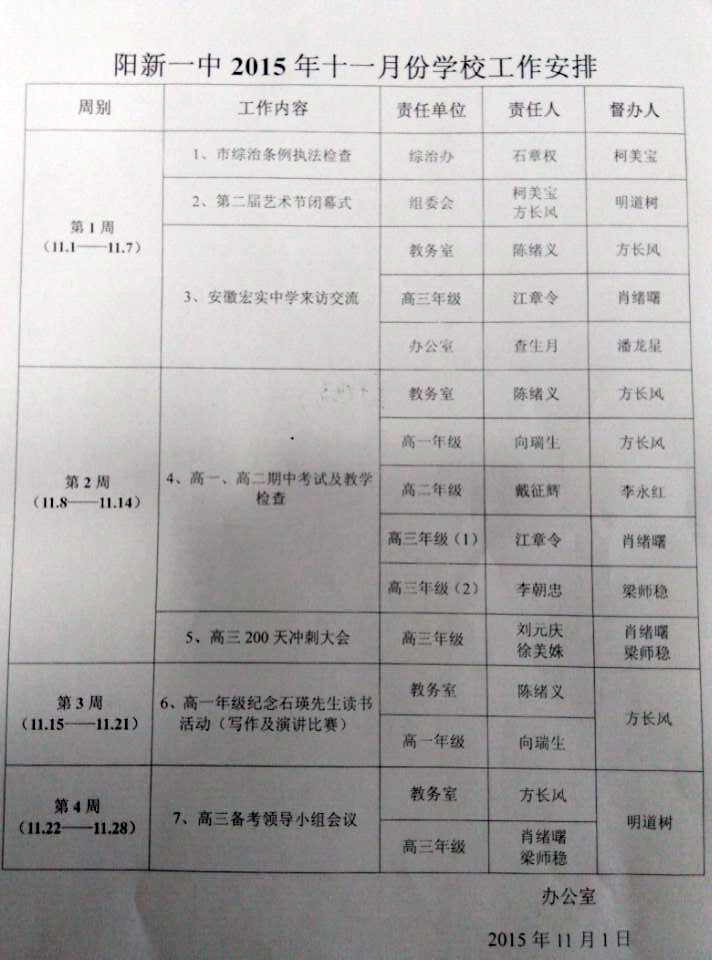 阳新一中11月份学校工作安排