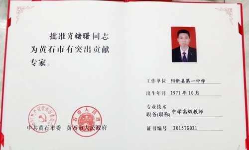 肖绪曙同志,华中师范大学在职硕士研究生,中共党员,阳新一中工会主席。自1994年参加工作以来,在阳新一中先后担任过18年班主任,10年年级主任,8年英语备课组长,共培养9位文、理科高考状元,其中2003年培养汪菡炜上清华大学(大冶、阳新两地文科状元);2013年兼任高三年级主任,精心指导,精致管理,培养黄石市理科状元柯飘飘、黄石市理科第二名曹汐和石志文三人分别上清华大学和北京大学;二十二年来指导高中学生240多人次在全国中学生英语能力竞赛中获国家一、二、三等奖;先后在校刊、县级、省级以上刊物发表论文120余篇;自工作以来主动资助贫困学生19人次顺利完成高中学业;此外通过“一帮一”结对子青蓝工程,指导徐美姝(团委书记)等八位青年教师成为英语教学骨干。总之,该同志坚持自己在教学、教研、育人、管理方面有“八心”:爱心、信心、公心、热心、细心、耐心、全心、恒心;认真负责,辛勤耕耘,曾多次受到学校和上级主管部门的表彰,各级各类获奖荣誉证书多达106张;连续十八年被评为“优秀班主任”;连续五年被评为“阳新县优秀教师”,“优秀党员”和“师德标兵”;2009年建国60周年被评为“首届感动阳新十大人物”,阳新电视台专题报导;2011年荣获“第三届华夏千秋教育基金园丁奖”,湖北电视台专题报导;2014年被评为“全国教育课程改革先进个人”;该同志工作业绩突出,教学成果显著,为阳新县乃至黄石市教育事业作出了巨大贡献。