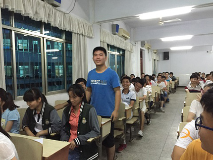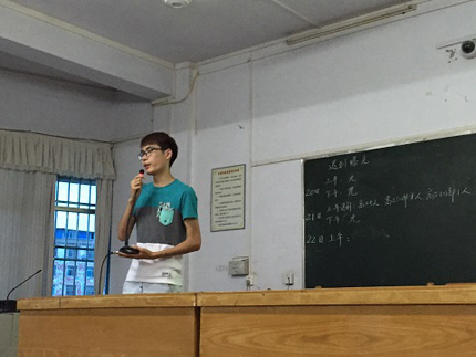 接下来,清风实践队队员杨航结合PPT正式进行宣讲。他先以华师的超长毕业照、千人打地铺等事件趣味导入宣讲,再介绍华师的百年历史、名人学者、雄厚的师资队伍和一流的教学实力。当介绍到化学学院王后雄教授时,现场更是一片沸腾。针对多数学生对华师专业设置的误解,队员们特地介绍华师其他非师范专业以及免师的优惠政策。然后,杨航又以大学里多样的活动晚会、精彩的比赛路演、形形色色的社团向同学们展示了华师全貌。介绍华师后,他大致介绍了外国语学院的专业设置、基本概况,鼓励同学们报考。最后,他结合自己的经历分享了一些高考经验,鼓励同学们以一个良好心态有技巧有效率有针对性地学习。队员邵宇杰也将自己的“高三学习清单”分享给大家,希望能对大家高三复习有一定帮助作用。