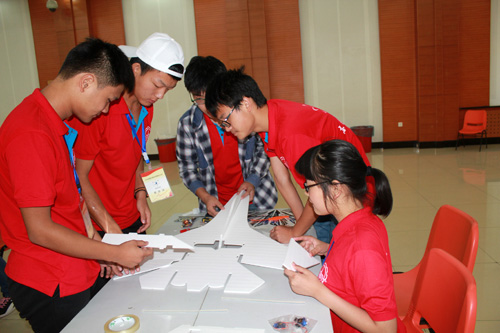 下午1:30,航模制作活动正式开始。本次活动分组进行,每组五名成员,由志愿者向各组分发航模制作材料。航模制作过程中,场面热火朝天,在航模协会志愿者的指导下,各小组成员积极讨论、分工合作,都希望自己的成果能够成为最佳航模。经过近三个小时的制作,各组别具特色的航模纷纷出炉。16:30,各组成员带着兴奋和紧张来到活动中心外进行航模试飞。经过航模协会志愿者们的反复调试,每一架航模都在营员们开心的笑容中成功飞上了天空。