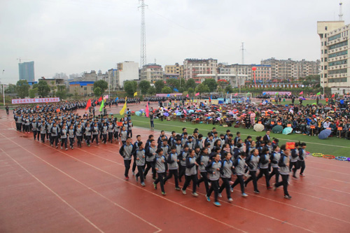 阳新一中各年级师生方阵依次列队进场。国旗方阵,五环旗方阵,校旗方阵,会旗方阵,迈步方正,整齐威武;彩旗方阵,花环方阵,彩球方阵,摇曳生姿;各年级师生方阵,精神抖擞,步伐铿锵,昂首挺胸,气宇轩昂。他们壮志满怀,英姿飒爽地走过主席台。