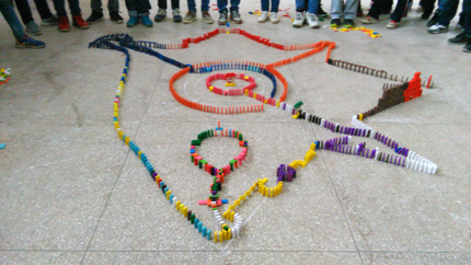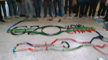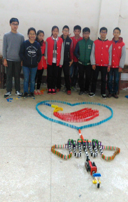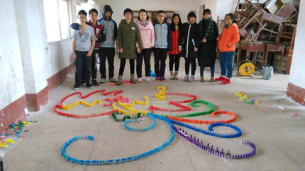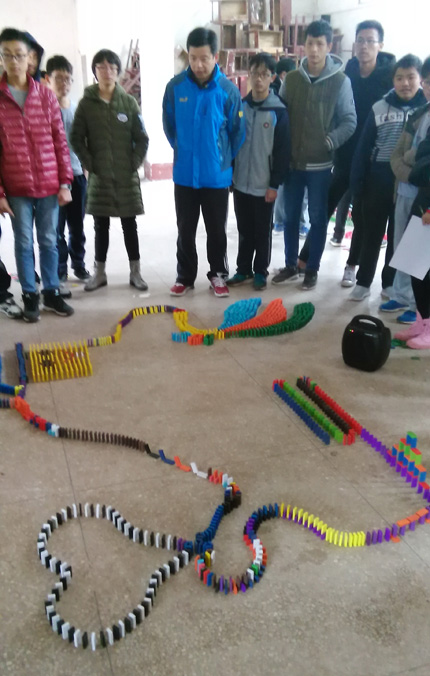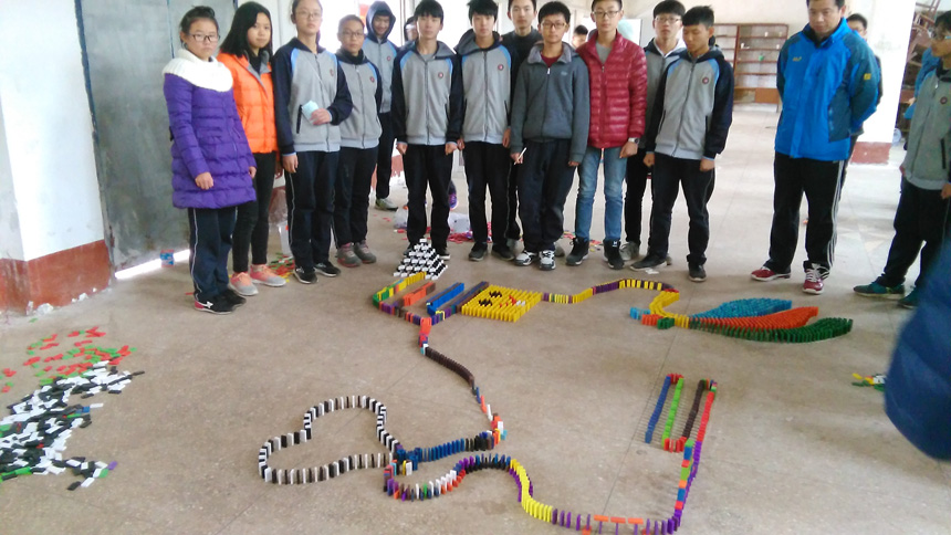 多米诺骨牌发源于中国,在欧美社会中则蔚为流行,是一种综合德智体美劳的运动,可以培养当代中小学生的团队协作能力,考验学生体力、耐心、意志力和临场应变能力,提高学生的动手能力。在第三届体育科技文化艺术节中,我校再次将多米诺骨牌纳入科技比赛项目内容,11月20日(周日)晚上,柯贤根老师对每个年级选派的两支队伍进行相关培训。正式比赛于11月24日上午9:30在新运动场看台底下的体育室举行,李永红副校长到场观看比赛情况。经过紧张、激烈、漫长的比赛过程,评委从骨牌倒塌情况、图案设计和寓意解说等几个方面进行打分,依据平均分高低依次决出第一名九年级(3)班、第二名高一(21)班、第三名高二(11)班,第四名高一(22)班,第五名高二(10)班。