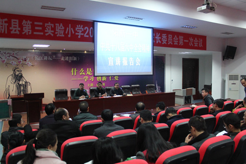 20161220日晚7:00在我校学术报告厅召开了中共十八届六中全会精神宣讲报告会。学校纪检组长方长风主持会议,邀请阳新县委宣传部副部长陈前波为全校中层以上干部、班主任和党员教师作宣讲报告。