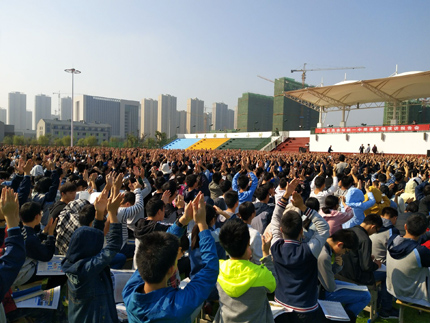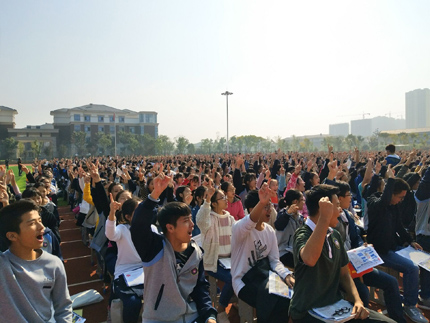 上午第二节课一下课,我校新校区高一、高二年级2000多名师生便涌入运动场。碧蓝的天空下,生机盎然绿茵场上,大家整齐坐下,充满期待。我校党委书记、校长明道树亲临现场,和同学们一起感受“疯狂”的节奏。在我校纪检书记李雁鸣的一翻慷慨激昂的欢迎辞中,现场气氛已经开始热烈起来。