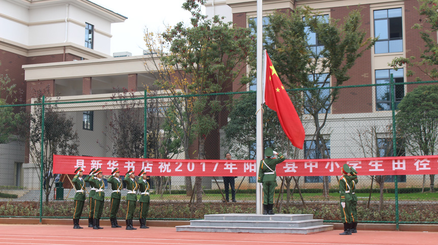 随着队伍集合的完毕,彩排在庄严的升国旗仪式中拉开帷幕。六名学生旗手,身着军装,迈着整齐矫健的步伐,英姿飒爽地走向国旗杆下,在场的所有人都默默地向国旗行注目礼,鲜艳的五星红旗冉冉升起,迎风飘扬。