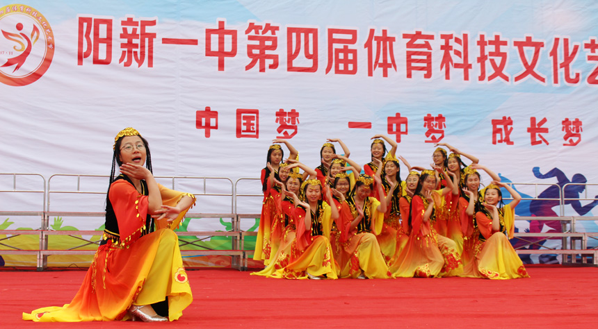 三项集体项目顺利结束后,文艺汇演正开始。本届艺术节开幕式共有16个文艺节目。有高二(1)部大合唱《启航》、校舞蹈社舞蹈《茉莉花开》、校团委教师朗诵《走进大一中》、高一(1)国学社经典诵读《少年中国说》、高一(2)舞蹈社舞蹈《花儿为什么这样红》、高一(3)戏曲社戏曲舞蹈《俏花旦》、高三年级教师舞蹈《彩蝶翩翩》、武汉纺织大学歌伴舞《丝绸之路》、校武术社武术表演《壮志凌云》以及校青少年科学院的科技制作成果展示等等。节目涵盖面非常广泛,既是体育、科技的盛宴,又是文化、艺术的大餐。