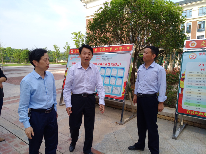 左起:阳新县科协主席郭召华、阳新一中党委副书记潘龙星、阳新县科协副主席柯陆武