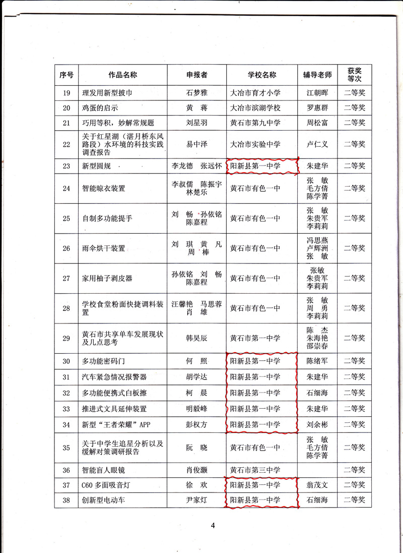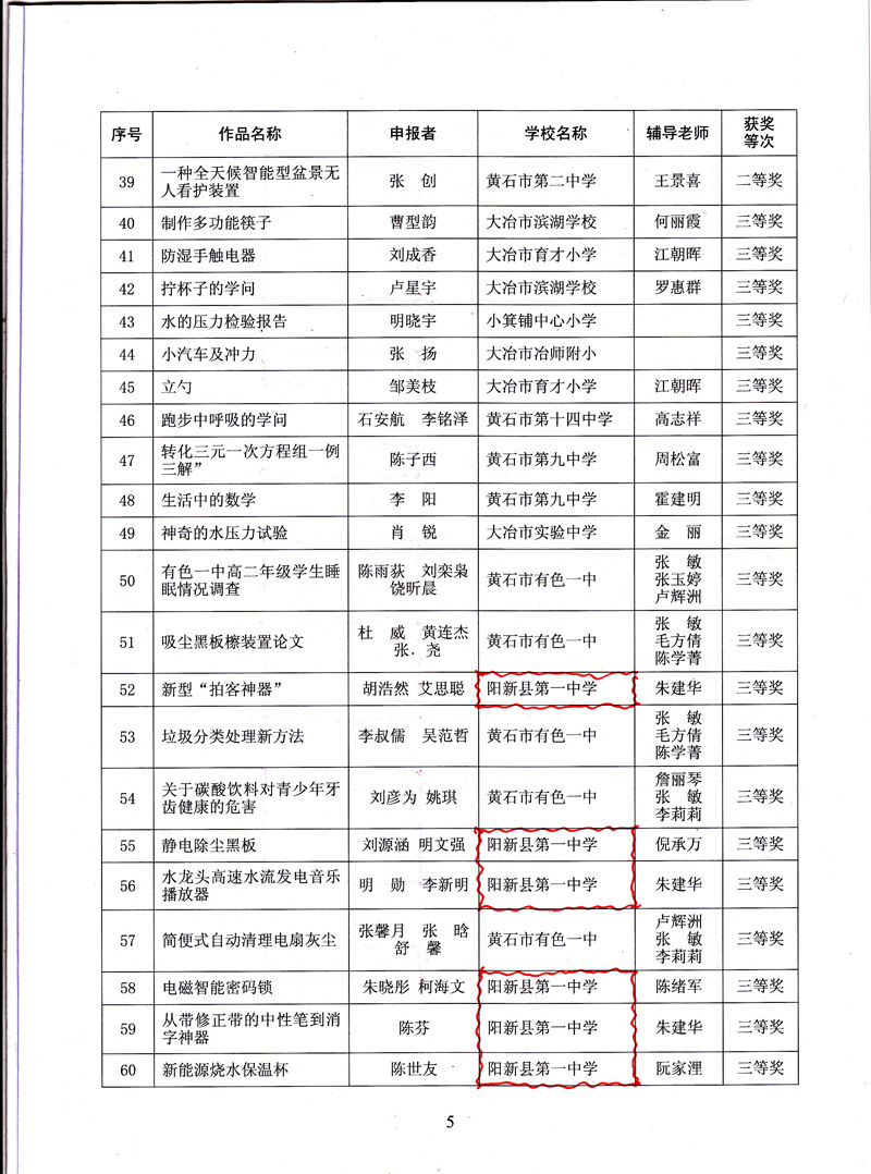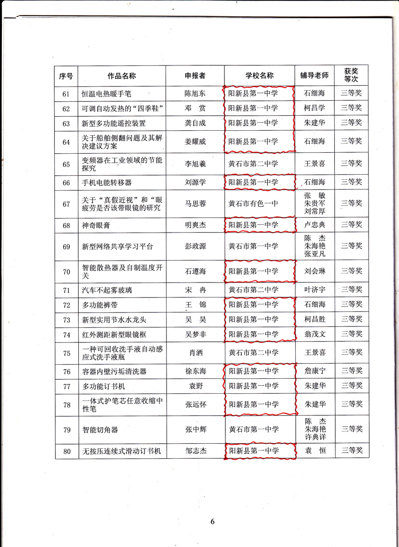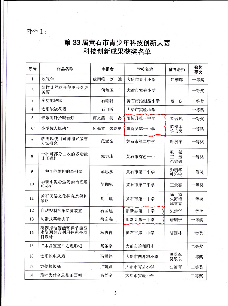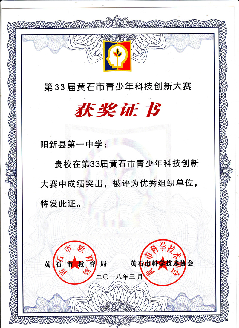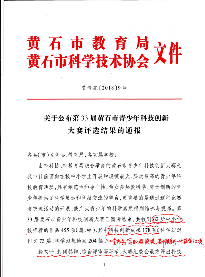 第33届黄石市青少年科技创新大赛各类比赛已圆满结束,全市62所中小学共选拔出178项科技创新成果参赛,经市科协和市教育局组织专家初评、封闭答辩、综合评审、网上公示等环节,大赛组委会最终评出科技创新获奖作品80项,其中阳新一中获奖32项,占62所学校获奖总数的40%,排名第一。阳新一中被评为优秀组织单位。