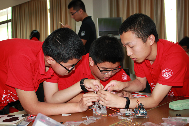 此次技术与设计分营活动于上午8:30开始。活动伊始,中德工程学院的吴建琼老师向同学们简短地介绍了中德工程学院的概况。随后,中德工程学院的张晓阳老师和朱瀛老师,具体向同学们讲解了有关手工制作的内容。此次的制作内容为一个多轴机械臂,是有关机械电子的内容,同学们对此展现了浓厚的兴趣,积极地参与讨论,并在小组内分工合作。