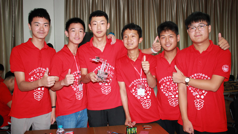 机械臂的材料为透明亚克力板和螺丝螺母等,运用了杠杆原理,由舵机将电能转化为机械能提供动力,充分的体现了机械运动定律,能量守恒等高中生耳熟能详的物理学规律。比赛开始,气氛紧张,一些队员出现急躁情绪,不少营员出现了失误操作。阳新一中营员参与的团队凭借分工合理,配合默契,最终获得了第二名、第三名的好成绩,第一名则被香港团队摘走。成功完成了的团队欢呼雀跃,合影留念,兴奋不已。