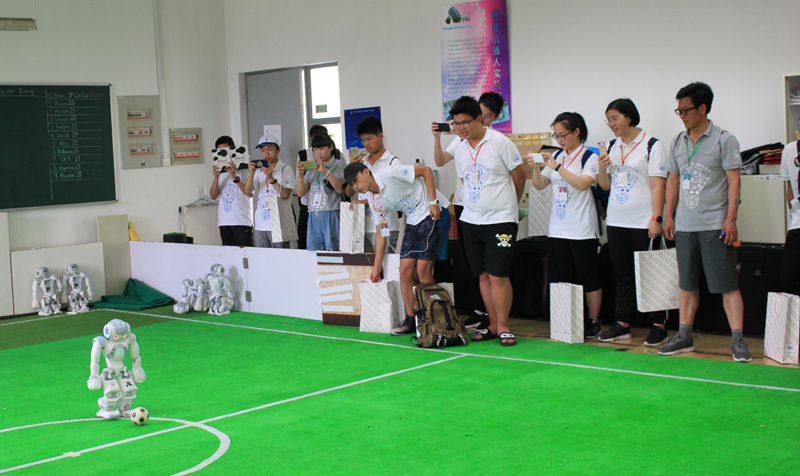 接下来,营员们在学长学姐带领下参观了智能机器人实验室。周光亮学长向营员们介绍了Robocup机器人比赛和机器人的控制原理,并操控机器人向大家展示了机器人射门、倒地再起等精彩动作。在VEX实验室中,韩哲简学长简要介绍了比赛规则,薛嘉琦学姐则向大家展示了机器人发球,带领营员们展开了一场激烈的机器人追逐战。营员们积极参与其中,与学长学姐们交流问答,享受着科技的魅力和其带来的快乐便捷,我们体会到了机器人的神奇与美妙。