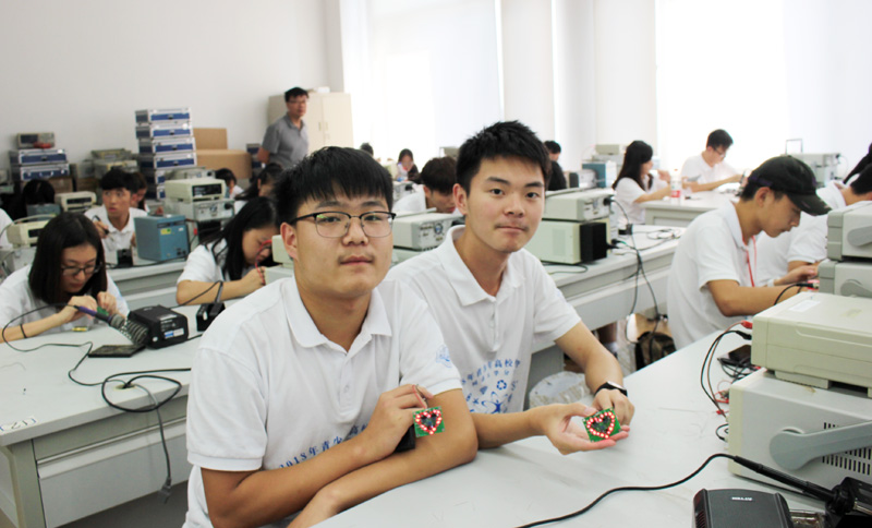 做完 stem,我们于下两点钟进入电子与信息工程学院重点实验室做电子设计知识创造,目标是制作一个微型电路。在教授细致而全面的讲解下,我们大概懂了基本原理。所用的材料是一块酚醛树脂基板,18 个发光二极管,3 个多电容,3 个三极管,6 个电阻,锡丝等。 所用工具有焊台, 欧姆表,钳子等。 刚开始手忙脚乱,但我们很快适应了工序,不慌不忙有条不紊地做起来 。