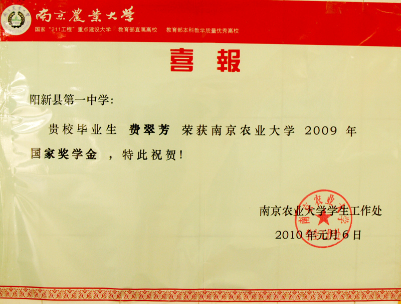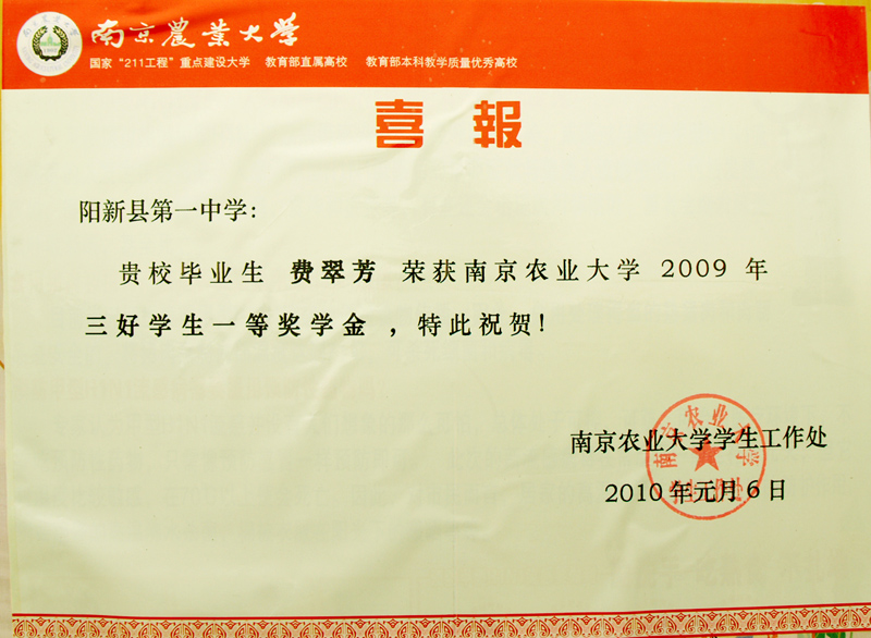 南京农业大学传来我校毕业生获奖喜讯