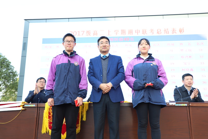 高二2部教学主任邓龙华宣读期中联考优胜者名单,德育室主任柏晓辉宣读各班期中评比优秀名单,高二1部德育主任程志勇、高二2部党支部书记洪登榜分别宣读第五届体育科技文化艺术节田径和才艺展示获奖名单,校长明道树、副校长李永红等分别为获奖班级和个人颁奖。