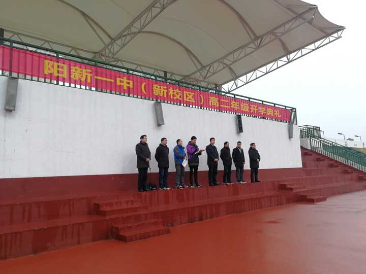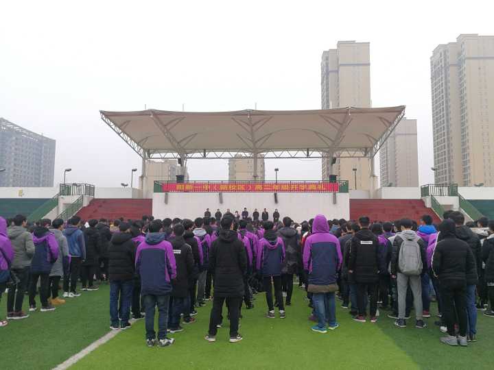 2月18日上午九点半,寒风拂面,细雨绵绵,湿重的五星红旗依然强劲地冉冉升起,雄壮的国歌声穿越校园,飘向远方:新校区高二年级1部2部师生近1200人共聚运动场,迎接新学期开学典礼。开学典礼由1部德育主任程志勇主持,升旗仪式开始前,他讲述了选择今天这样一个不受部分学生待见的日子举行开学典礼的理由:风雨兼程,何言困苦;早人一步,行动在先;开启征程,仪式护航。