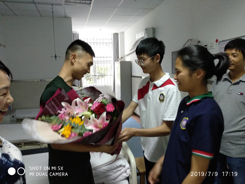 7月9日下午,受校党委所托,党办主任徐美姝、德育室主任柏晓晖、副主任肖鹏,团委副书记陈湖庚带领学生一同慰问我县见义勇为英勇负伤的党员尹文杰同志,并送上了慰问金。