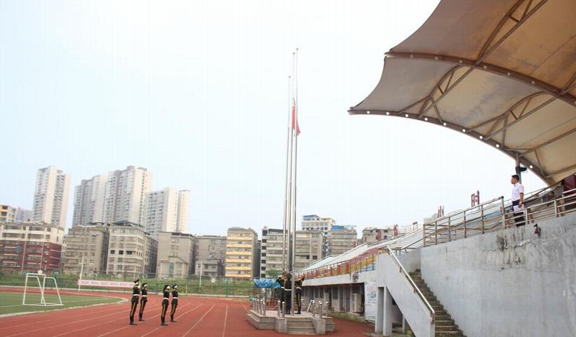 在雄壮的国歌声中,五星红旗在国旗班队员的护卫下冉冉升起。全场师生行注目礼。