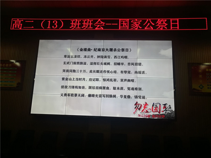 班主任郭衍松老师对班会进行了点评并对同学们提出了五点要求。作为中学生的我们,为了82年前那场惨绝人寰的人类悲剧不再在我们中华民族子孙上重演,为了我们美丽的未来梦和中国梦,我们现在就应该努力做到以下五点:1.早起床,戒懒惰,博学强记,渊博知识,养好习惯。2.认真听,勤动脑,尊师重教,拓展思维,发展智力。3.爱钻研,多讨论,独立作业,创新探究,勇于创新。4.交益友,做真人,团结互助,见贤思齐,理解宽容。5.正三观,重公德,弘扬正气,明理诚信,爱家爱国!