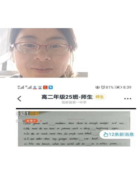 同学们,你们也不是孤军作战。为确保网学质量不下降,你们父母做了大量事情,为他们耐心陪伴喝彩。隔山隔水难隔你我,班上老师一直同你们并肩作战。早自习老师与你们一起晨读,视频直播课,老师陪你们听,老师还要细心批改作业,积极尝试直播答疑。