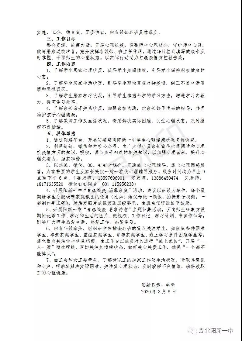 为了落实"全面育人,立德树人"根本任务,积极响应教育部省市县教育主管部门号召,全面开展心理防疫工作,打响防疫“心战场”,阻击疫情“心病毒”,阳新一中制定《阳新一中“抗击疫情 守护心灵”心理健康教育实施方案》。
