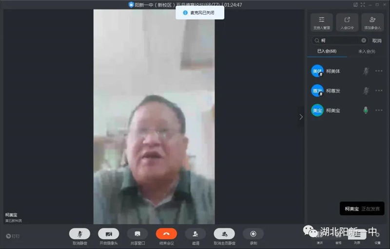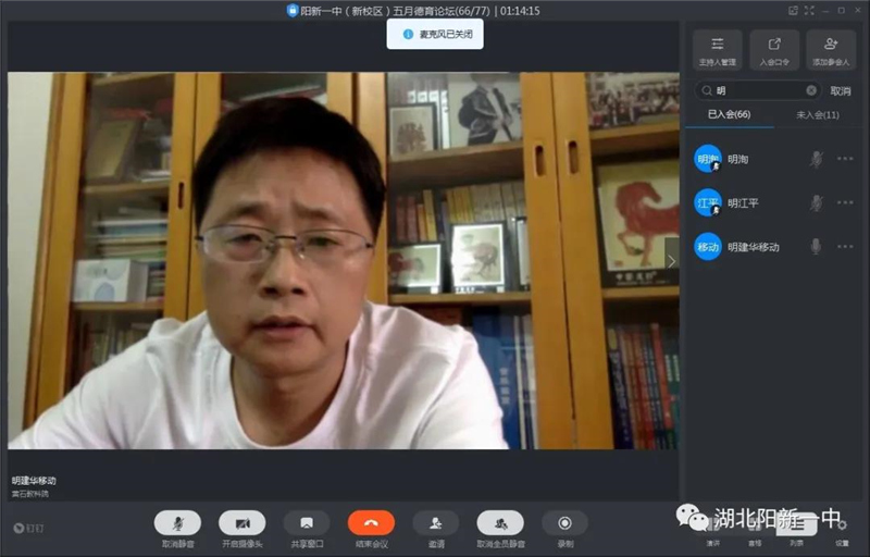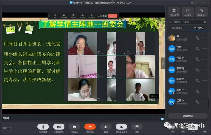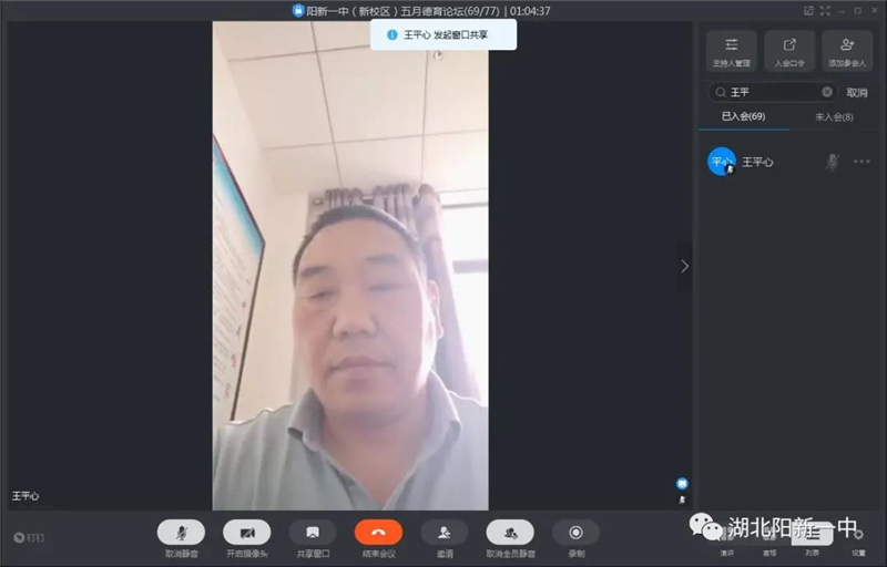 29日下午,阳新一中新校区线上举办2020年德育论坛(第五期)。新校区校委会全体成员、学生发展中心全体干部、全体班主任参加活动。本次德育论坛由德育室主任柏晓晖主持。