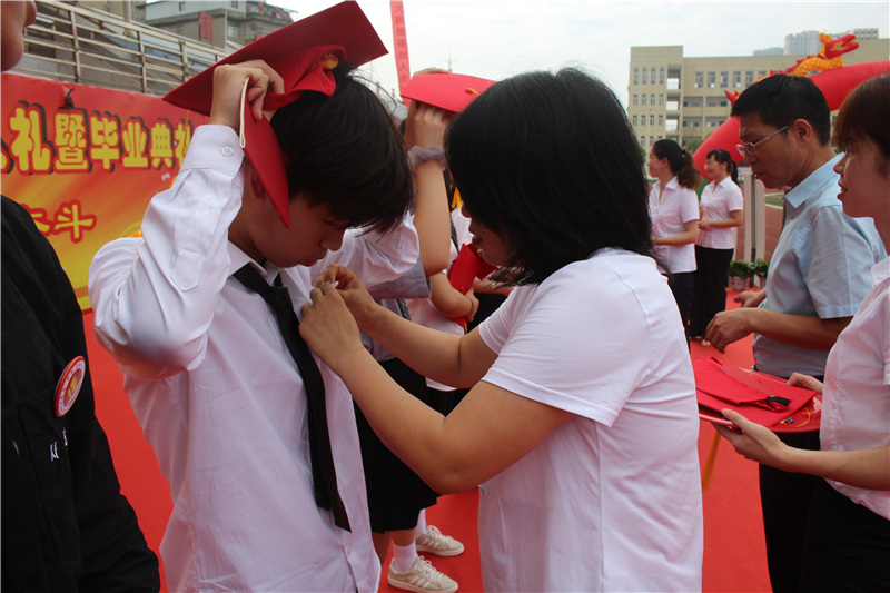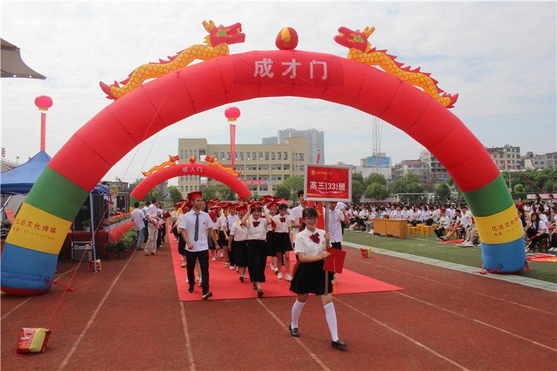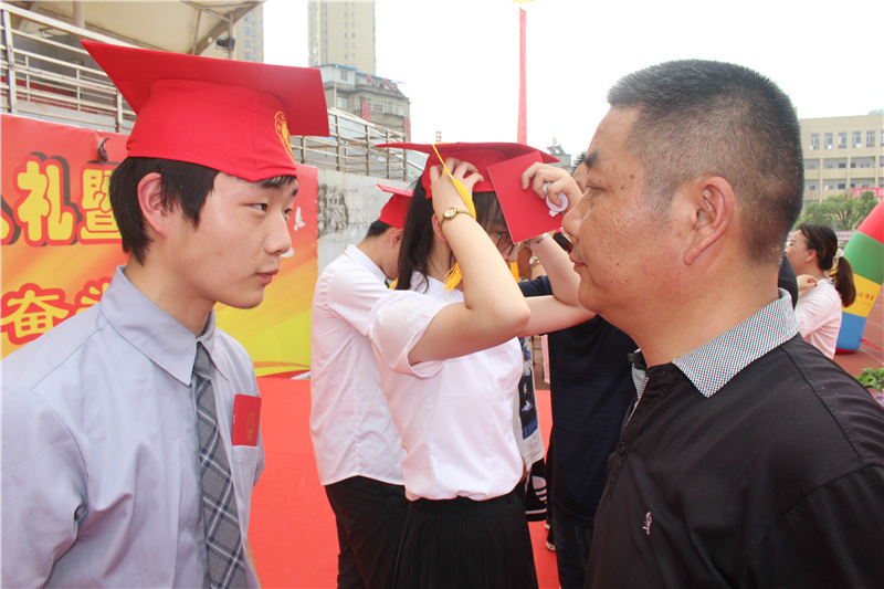 跨越成人门。各班领队高举着班牌和班旗,同学们一个个穿戴整齐,笑逐颜开,步履矫健,迈进成人门,奔向成才门,为各班任课教师献花敬礼。师生见面,或握手,或相拥,或诉说。老师们挂满了笑容,祝福同学们成人;同学们脸上乐呵呵的,心里美滋滋的。
