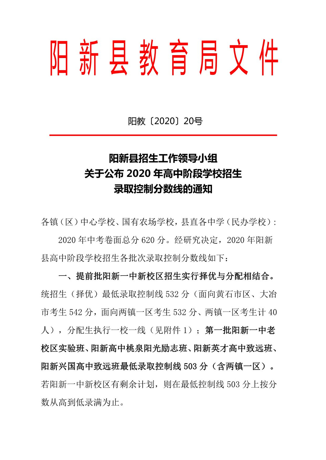 县教育局关于公布2020年高中阶段学校招生录取控制分数线的通知