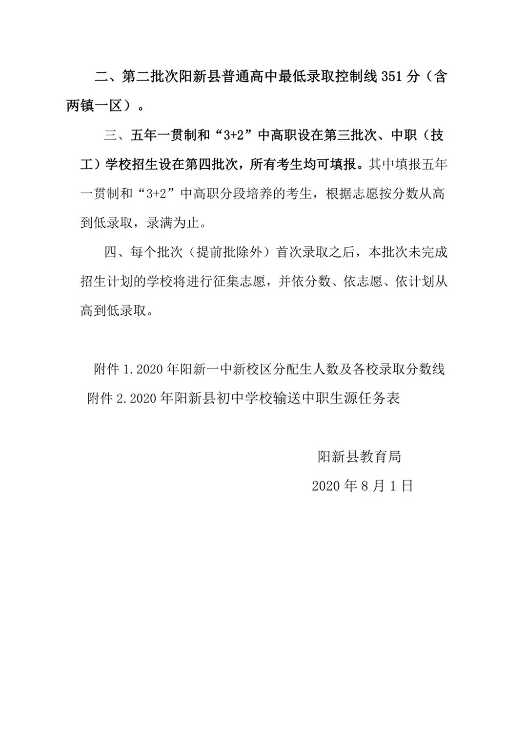 关于下达2020年阳新县高中阶段学校招生计划的通知