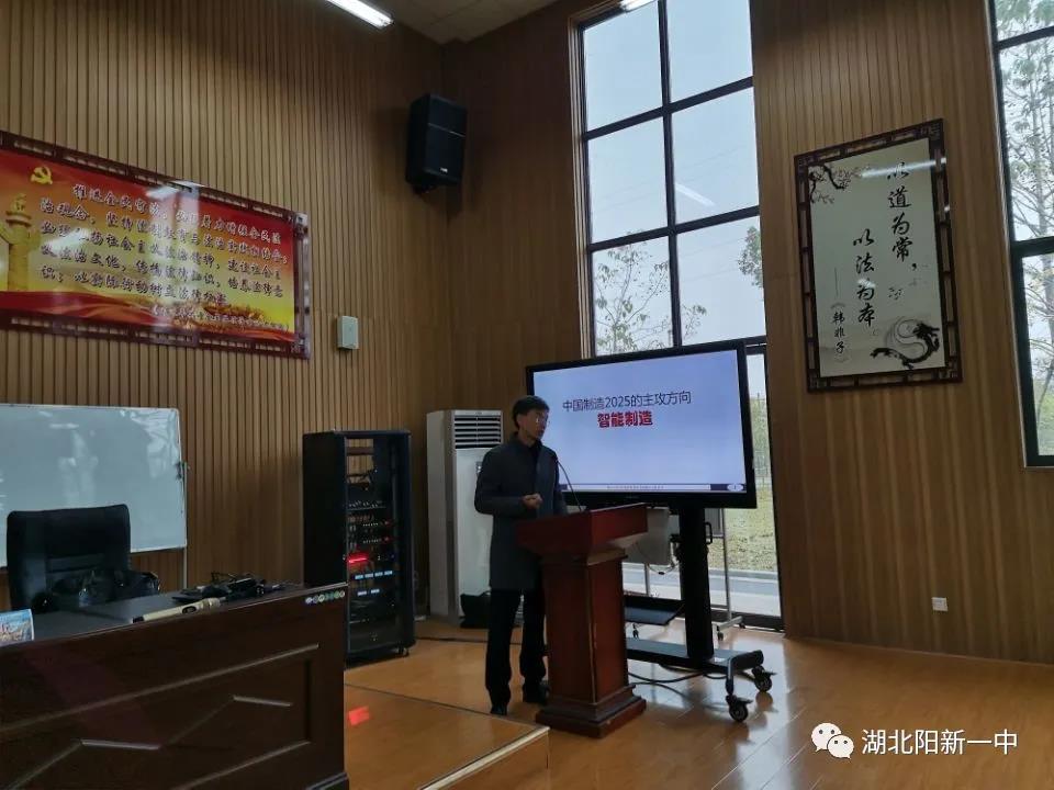 29日上午,在明礼楼报告厅,南京航空航天大学博士生导师唐敦兵教授给高二部分学生作了一场精彩的报告。讲座题目为《智能制造新模式与新技术》,本场报告由高二年级主任陈洪星主持,南京航空航天大学机电学院党委书记袁智强(阳新一中84届校友),在阳新一中党委书记、校长明道树陪同下参加了讲座。