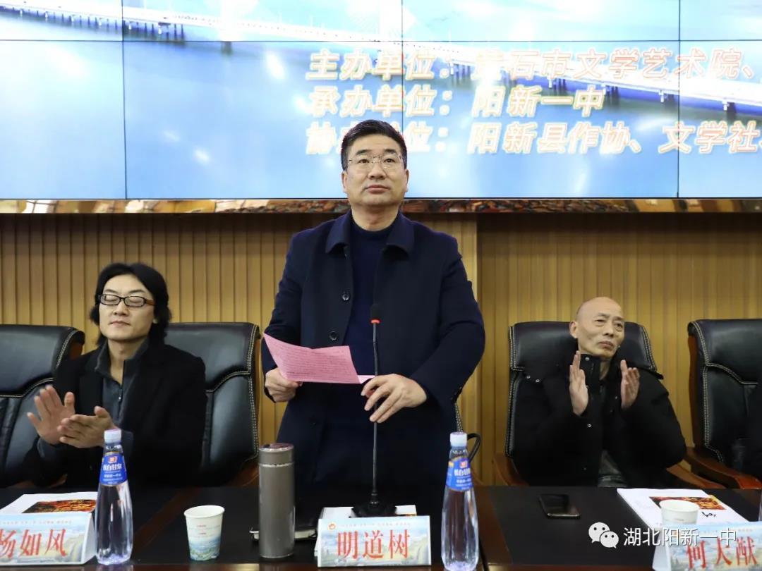 明道树校长在致辞中,对何大猷、杨如风先生及作家朋友们的到来表示热烈的欢迎。他说,千年雉域,人文荟萃,百十年一中,薪火相传。阳新一中是阳新文脉的重要传承者,弘扬优秀传统文化,一中学子理应担当起使命;他要求,一中学子多读书,读好书,用经典滋润人生,放飞文学梦想;他指出,青春年少本是一首美丽的诗,校园文学创作,天地广阔,大有作为;他肯定,学校对内盘活资源,对外引进智力支持,搭建省市县校四级文学平台,从校刊《竹林》出发,我们一中学生的文学作品正出校园、入阳新、到黄石、抵达湖北,与省市县乃至全国的读者见面。展示了阳新一中学子的文学才华,宣传了阳新一中,与新高考改革背景下的大语文教学要求高度契合;他勉励,我校师生借力散文节这一契机,借力艺术节舞台,借力我校“同读一本书”“周末文化讲堂”“腊八诗会”等艺术文化活动媒介,用艺术装点自己的气质,用文化充实自己的灵魂,做一个有高雅气质和高贵灵魂的一中人;他提出,要努力把一中学子培养成为具有传统文化底色、家国情怀、国际视野的高中生,为阳新社会经济文化发展、中华民族伟大复兴提供宝贵的人力智力支撑。
