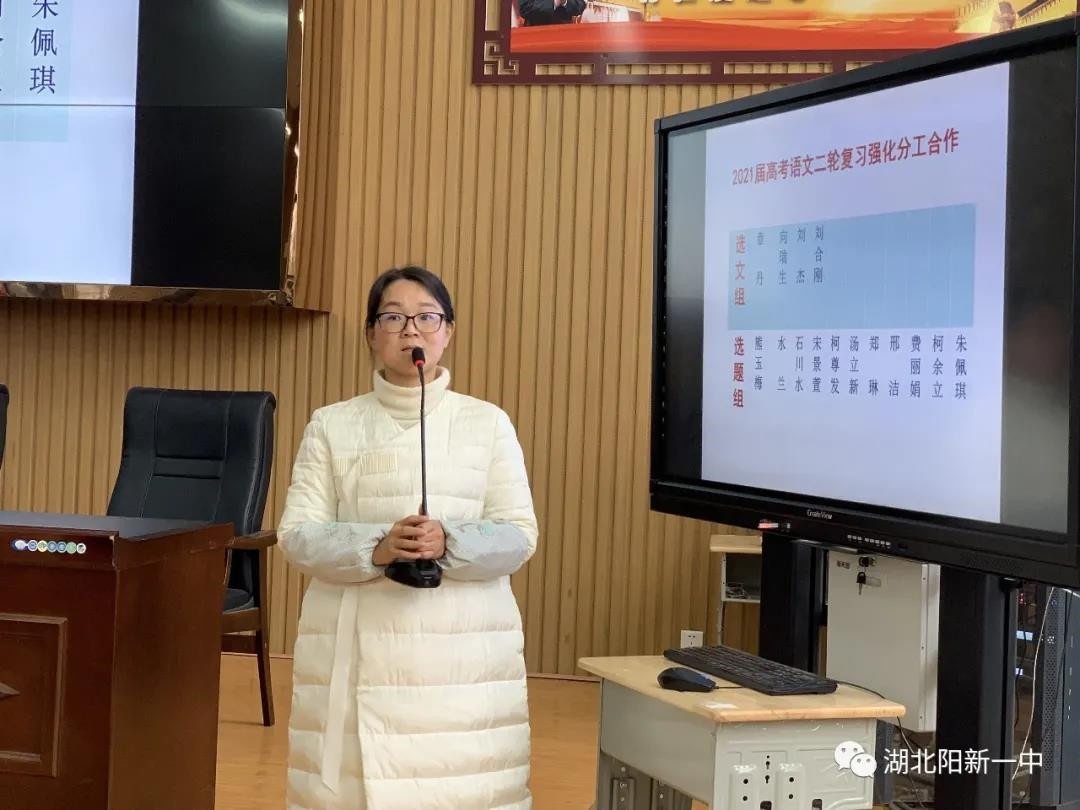 在汇报复习计划环节,高三语文备课组长章丹从“近期复习计划,小说复习安排,常规工作落实”三个方面汇报高三语文组在新高考背景下的一轮复习计划,并强调高三语文组“时评阅读”和“作文训练”在序列化训练上作出的努力。