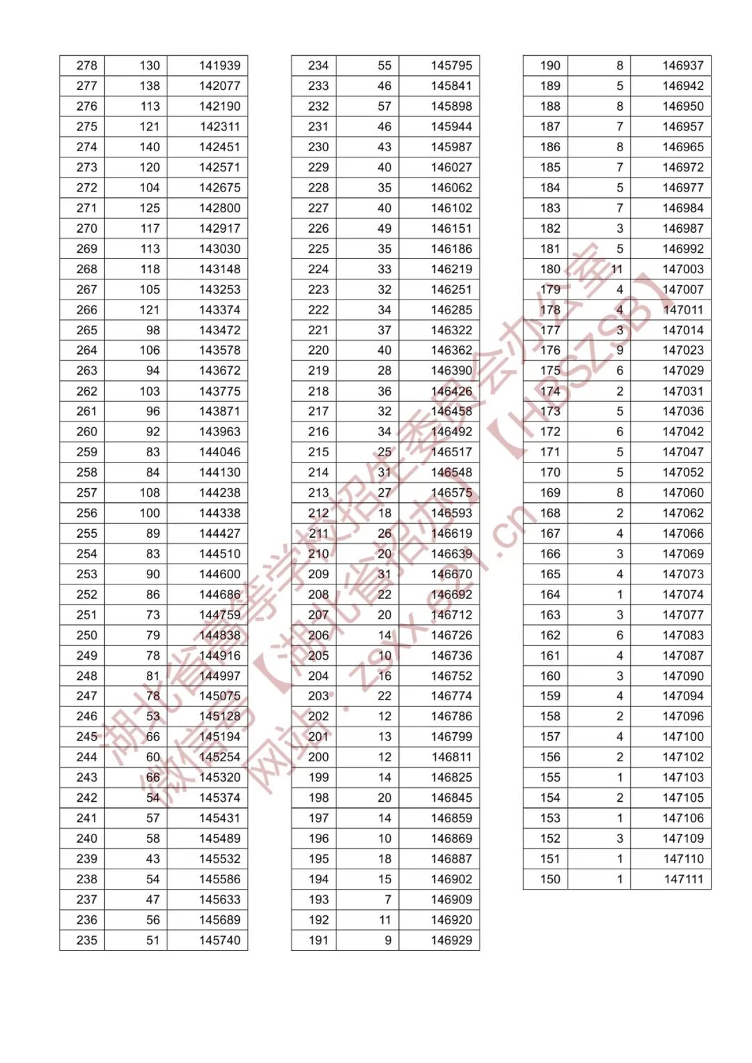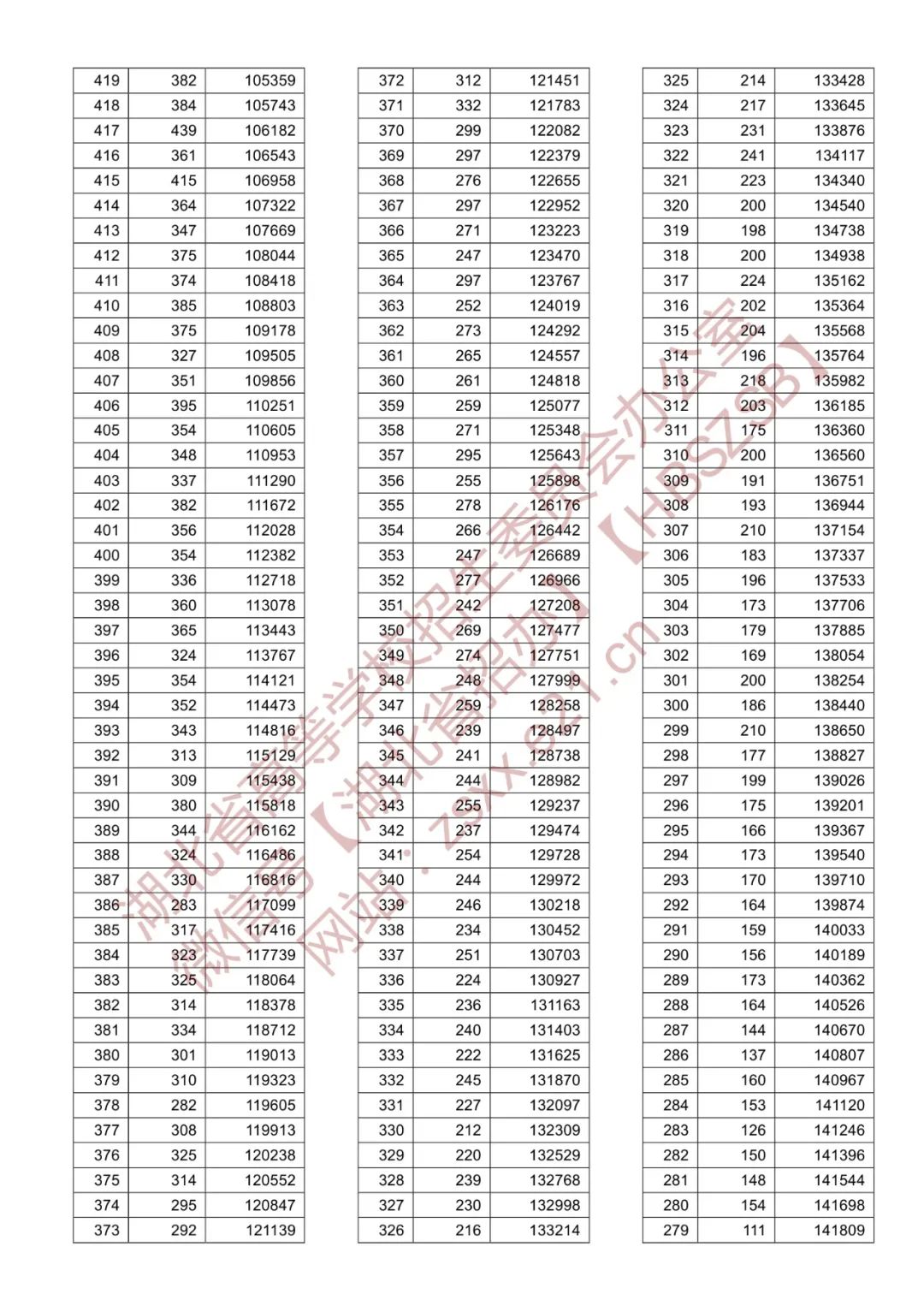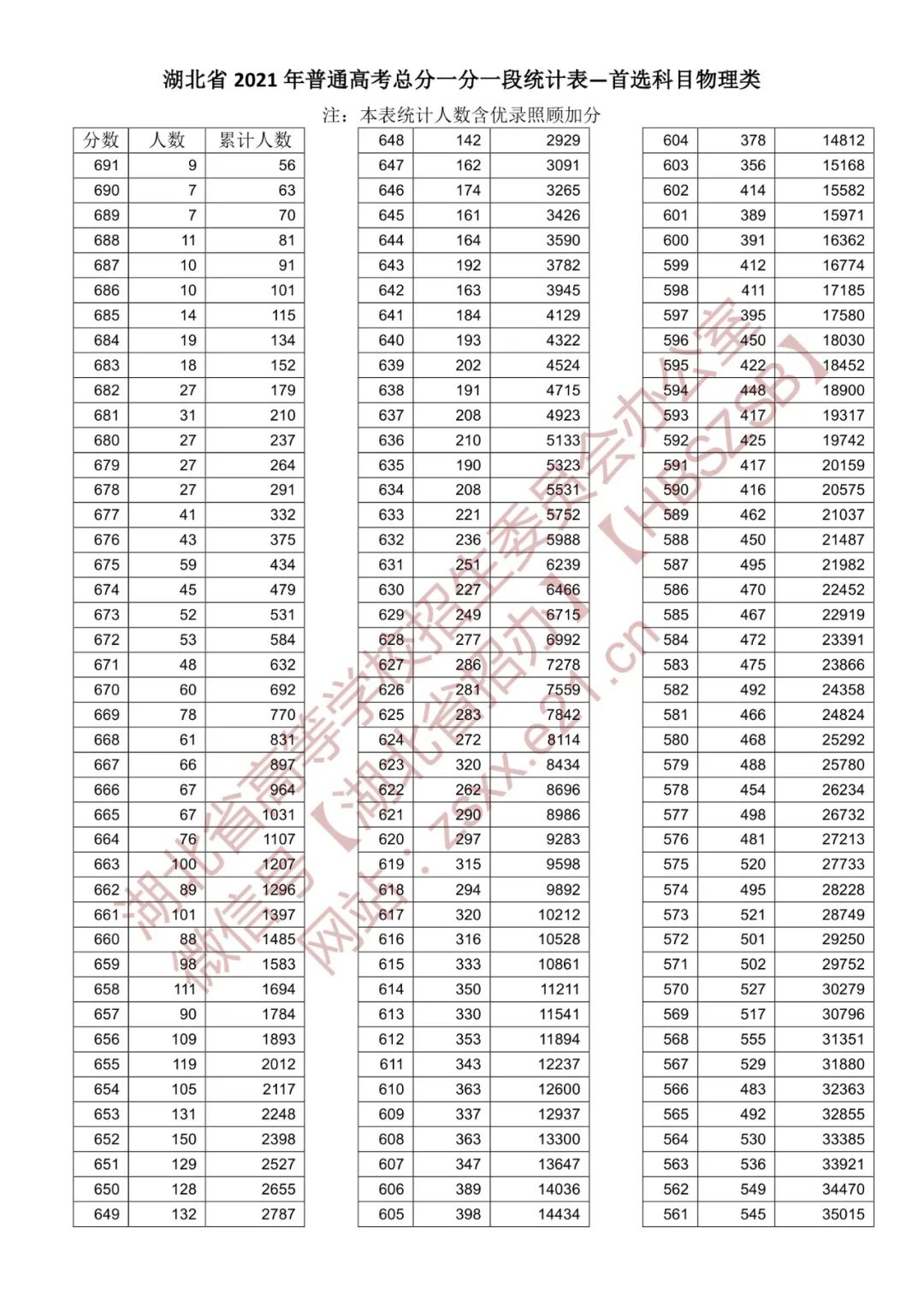 湖北省2021年普通高校招生排序成绩一分一段统计表(首选物理)