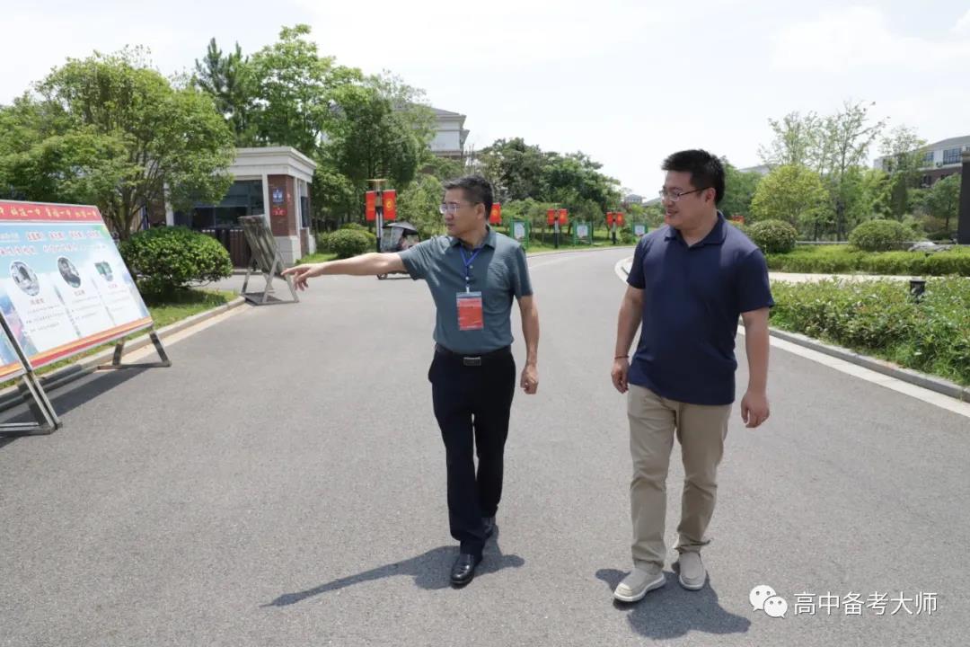2021年06月25日,清华大学驻湖北省招生组张熠教授走进阳新县第一中学,阳新一中党委书记、校长明道树(左)陪同张教授参观校园。