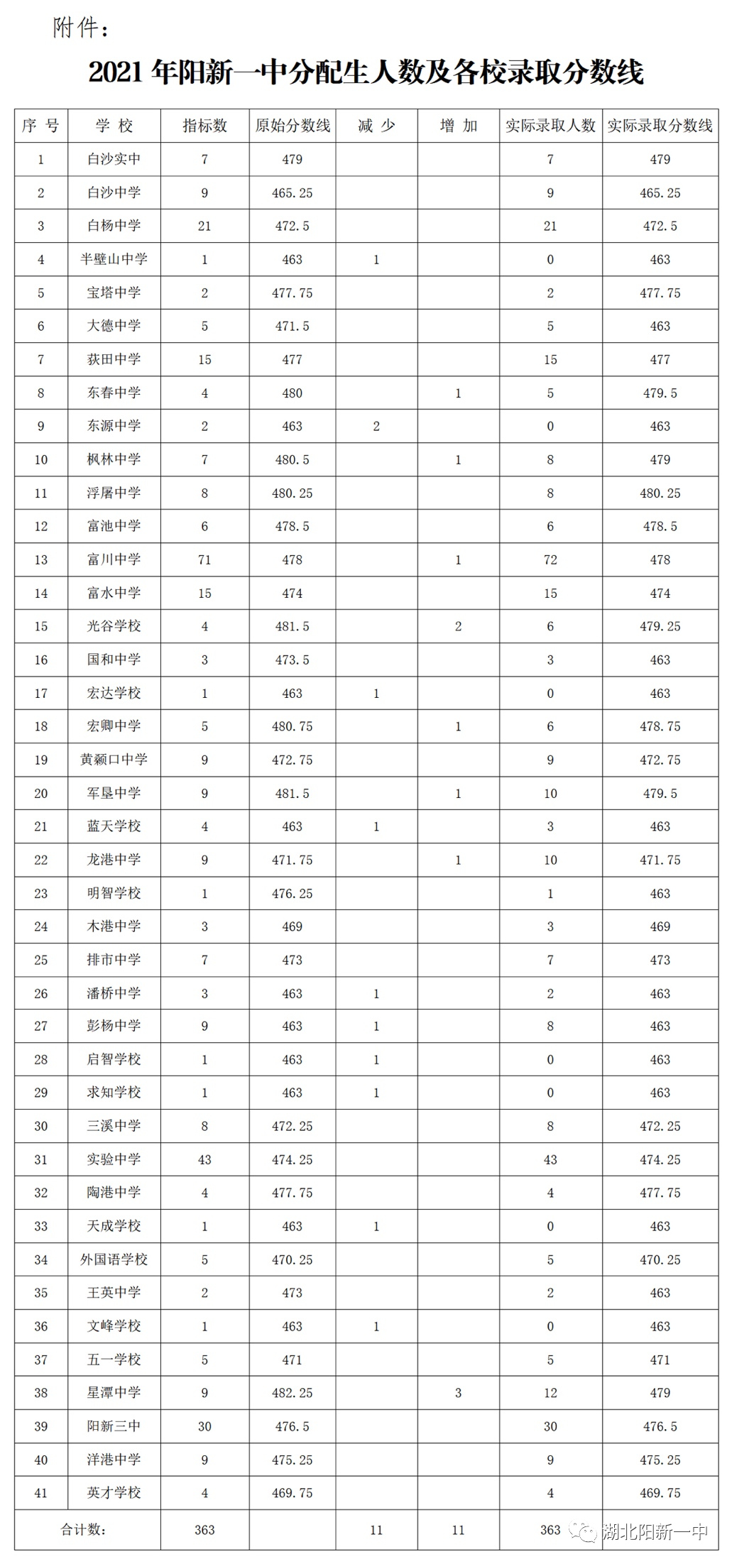 (2)分配生:执行一校一线(见附件);阳新一中最低录取控制线463分(含“两镇一区”和新港物流园区)。若阳新一中有剩余计划,则在县内463分及以上考生中从高分到低分录满为止。