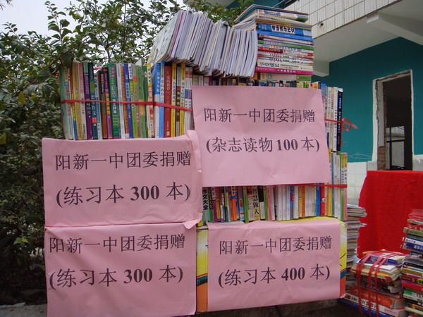 此次捐赠的物品有团县委价值6000余元的爱国主义教育光碟和体育健身器材,阳新一中的70套文具、2000本作业本、2000本各类书籍以及2000元的现金。
