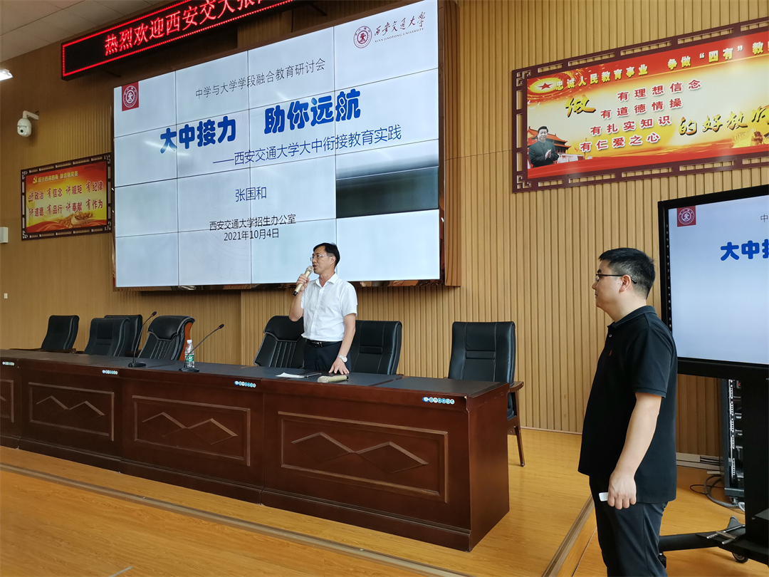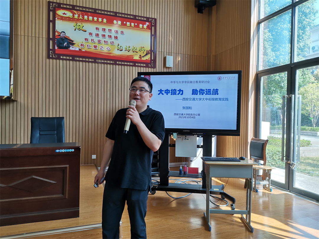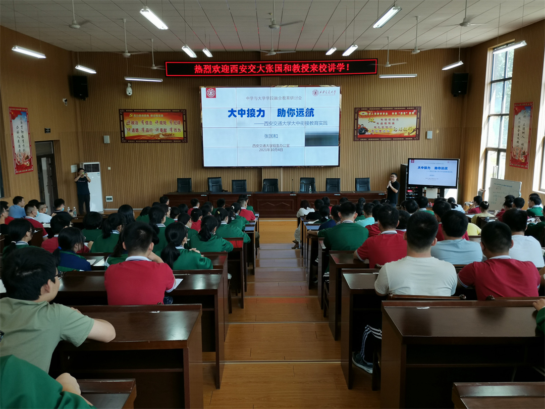 张国和教授从四个方面介绍了西安交通大学的育人体系、育才理念、科技成果和招生特色:一是针对当代高中生特点开展品行养成教育;二是面向新时代社会需求开展创新能力培养;三是与企业社会深度融合开展实践能力培养;四是抓牢立德树人总目标开展家国情怀教育。他说,西安交大是中国著名的C9联盟高校,也是一所985、双一流名校,教科研实力雄厚,是“一所能在浮躁世界中放下一张平静书桌的大学”,欢迎优秀的学弟学妹们报考西安交大。在讲座中,同学们表现出对张教授无限喜爱和崇敬,也表现出对西安交大的无限向往!