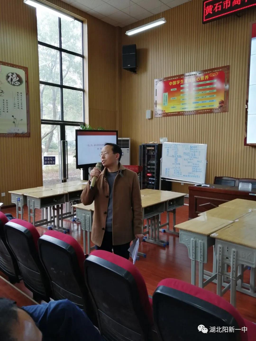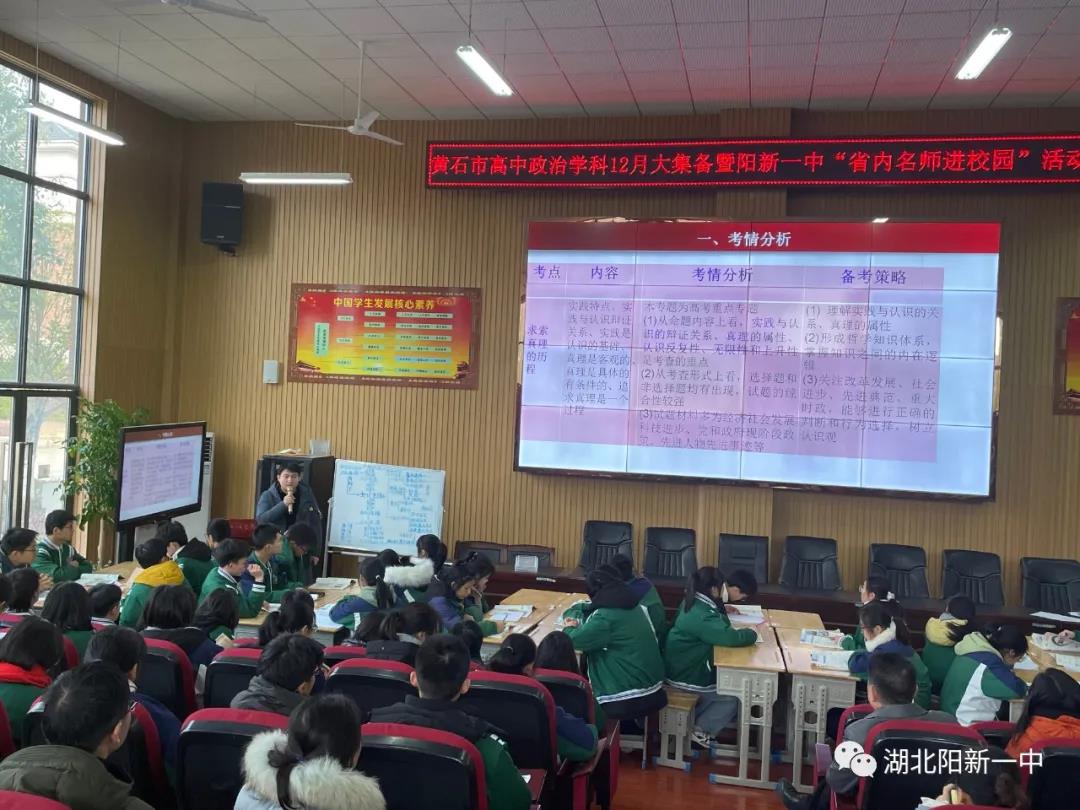12月27日上午,黄石市12月高中政治 “大集备”活动在我校明德楼报告厅举行。黄石市政治学科教研员马海平、阳新县教科院副院长郑宏图、黄石市高中政治教师参与活动,省内名师、襄阳四中任守生老师主讲二轮复习示范课并作主题报告。活动由阳新一中政治教研组长余胜利主持。