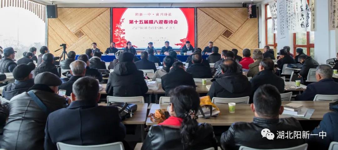 “苟日新,日日新,又日新。”红梅初绽,暗香浮动,春已近。元月8日,阳新一中.富川诗社第十五届腊八迎春诗会在全国文明村三溪镇姜福村沁心园山庄举办。在主席台就坐的领导有:湖北师范大学文学院原院长黄群建教授,湖北省特级教师、阳新一中党委书记、校长明道树,三溪镇党委书记虞润卿,阳新县文联主席彭书桃,阳新诗词学会会长潘世信,阳新一中党委副书记潘龙星。退休干部、副县级领导蔡定扬、龚正仁及文联各协会主席黄治杰、李相文、袁冠烛等在前排就坐。富川诗词学会、县作家协会、县书法家协会会员及阳新一中教师180余人与会。特邀阳新电视台、黄石日报记者参会。诗会第一阶段由富川诗词学会常务副会长洪登亮主持。诗会第二阶段由阳新一中教师余秋桦主持。