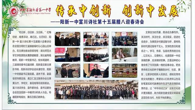 2022年1月8日,“阳新一中·富川诗社腊八迎春诗会”创新形式,走出校园,走进三溪镇沁心园,阳新一中教师与阳新县诗词学会的诗人们以原创作品共同打造出了“沁心园诗廊”。
