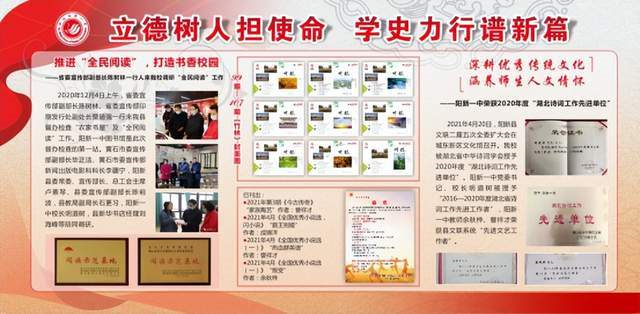 深耕优秀传统文化,涵养师生人文情怀,阳新一中结硕果。2020年,阳新一中被授予“中华诗教先进单位”,荣获“湖北省诗词工作先进单位”。湖北省特级教师、阳新一中党委书记、校长明道树被授予“2016——2020年度湖北省诗词先进工作者”。