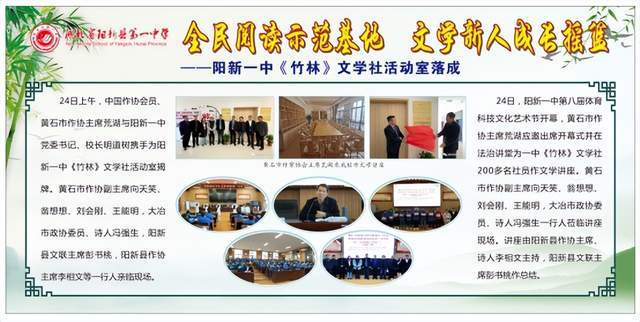 一中前行,得众人之力。阳新一中克服经费困难,筹集社会资金十万余元,建成了《竹林》文学社活动室。2021年11月24日,黄石市作家协会主席荒湖及市作协主席团成员向天笑、翁想想、刘会刚、王能明,阳新县文联主席彭书桃,阳新县作家协会主席李相文等出席揭牌仪式。