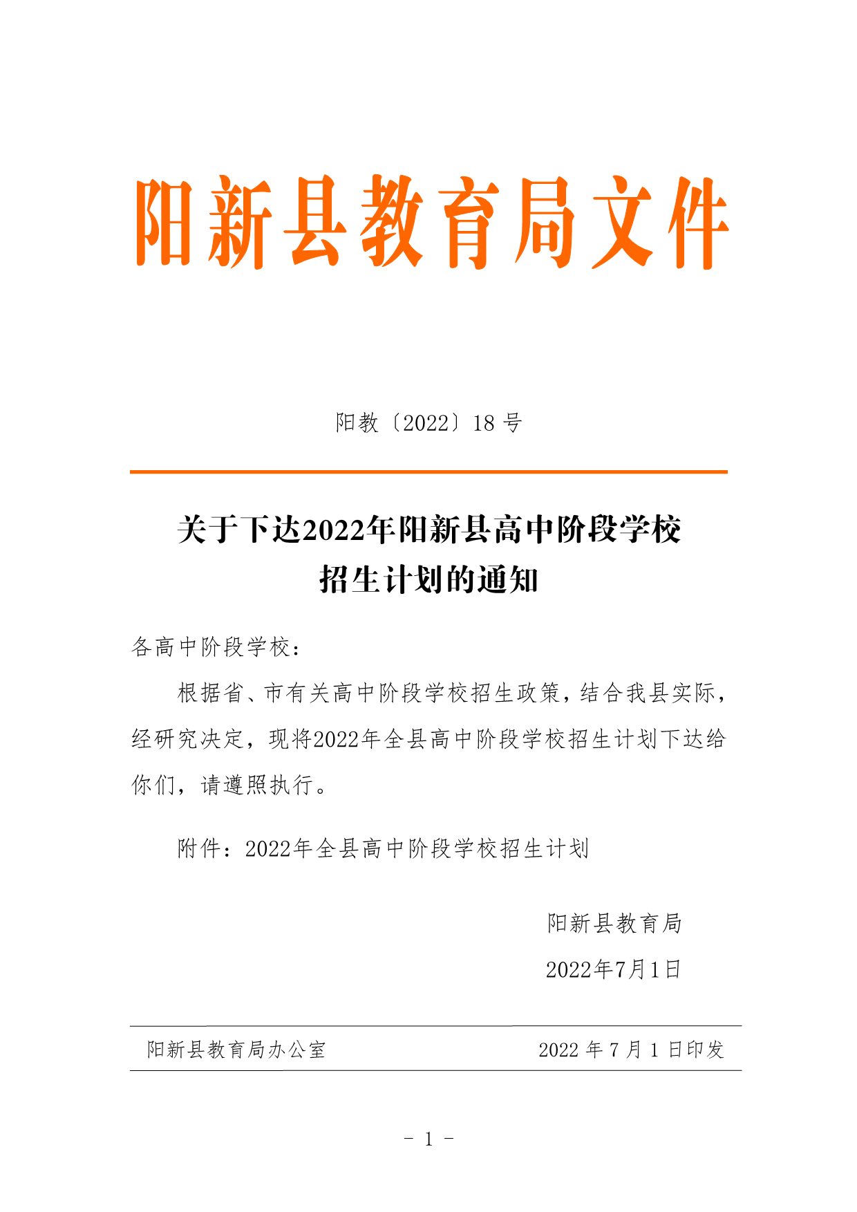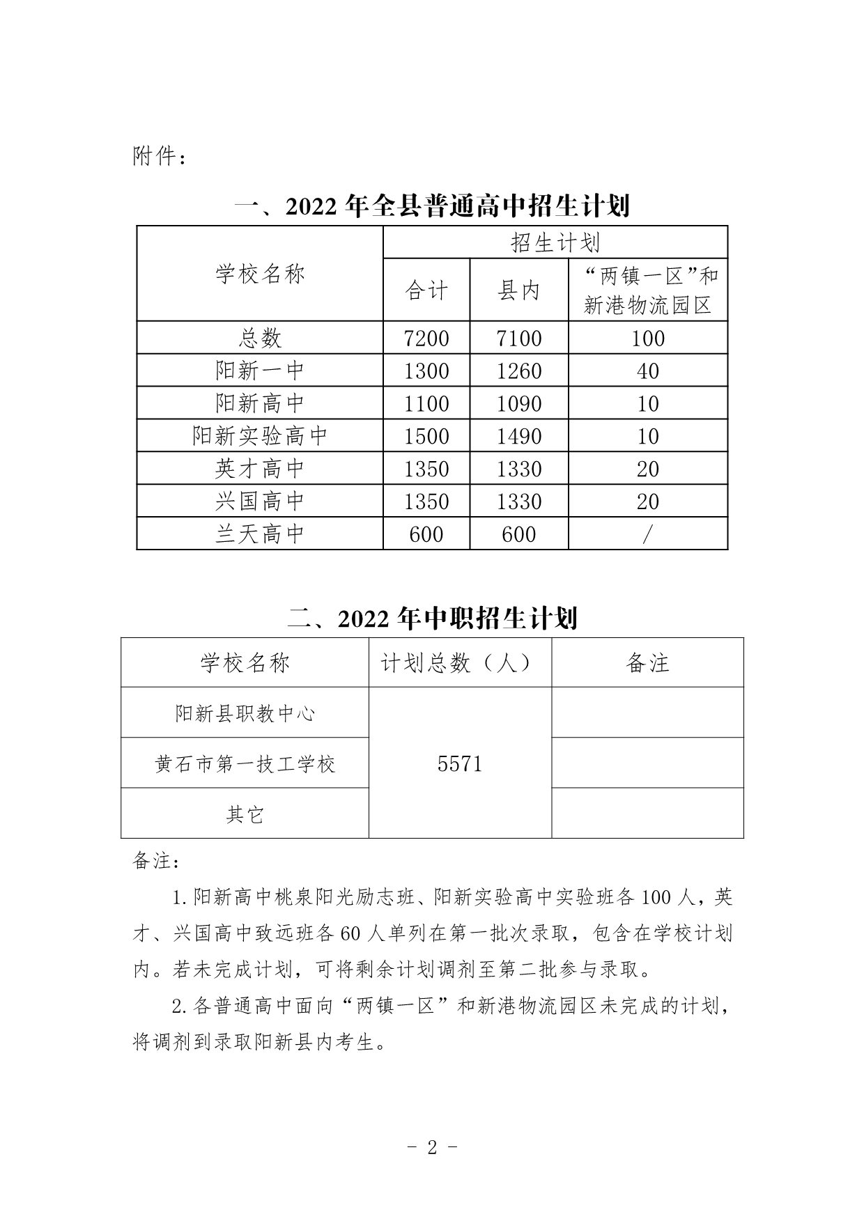 关于下达2022年阳新县高中阶段学校招生计划的通知