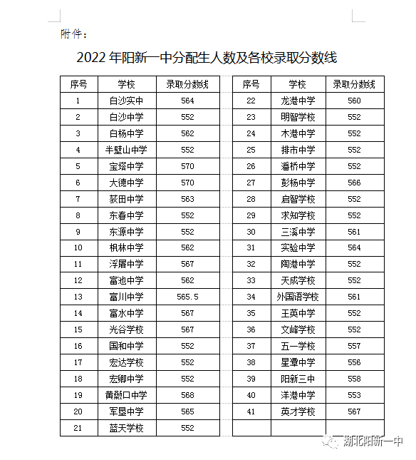 (2)分配生:执行一校一线(见附件);阳新一中最低录取控制线552分(含“两镇一区”和新港物流园区)。若阳新一中有剩余计划,则在县内552分及以上考生中从高分到低分录满为止。